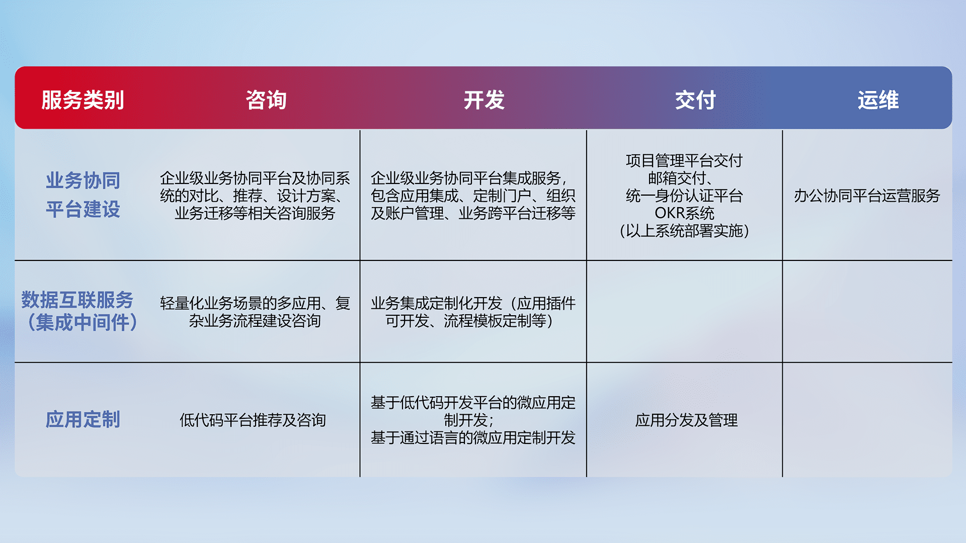 针对钉钉、、、企微、、、IDaas等平台级产品提供产品的规划、、、、方案、、、、交付、、定制化开发等服务,,,,实现如统一协同办公、、智能客户服务、、混合会议管理、、智能数据查询、、、等业务场景,,实现数字化转型。。。。